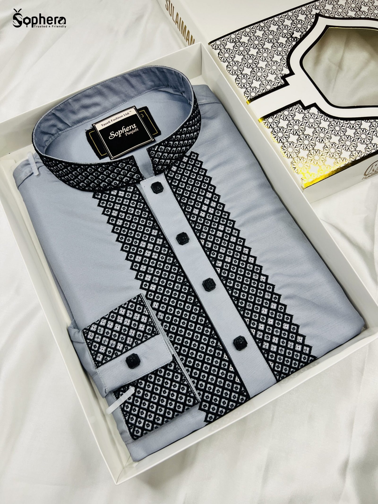 নিখুঁত কারুকাজ: পাঞ্জাবিটির কলার, প্লাকেট এবং হাতার কাফ-এ করা হয়েছে অত্যন্ত সুক্ষ্ম ও আধুনিক এমব্রয়ডারি ডিজাইন, যা এর প্রিমিয়াম লুককে আরও বাড়িয়ে দিয়েছে।